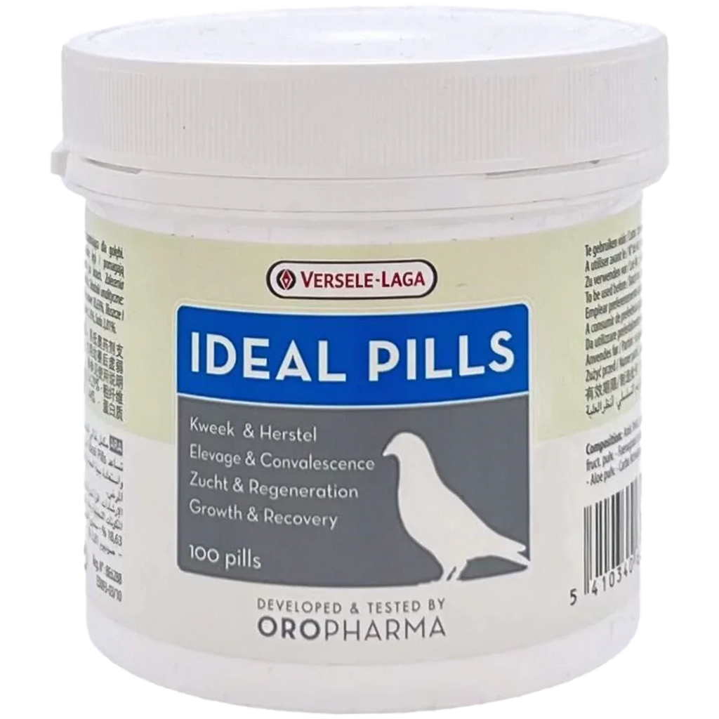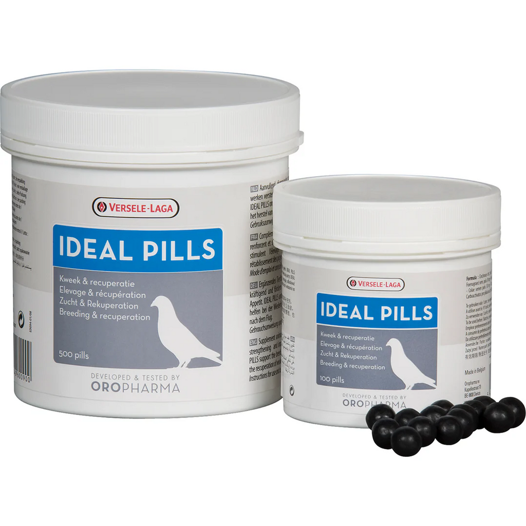 Complementary feed for pigeons. Oropharma Ideal Pills are health pill on the basis of plants and herbs. This dietary supplement promotes the appetite and digestive function, supports breeding, and promotes the down moult. Ideal Pills contain a selected combination of plants for the benefit of the digestion and the metabolism. Ideal Pills promote the appetite and stimulate the stomach. Lost or weakened pigeons recover quickly with this product.
